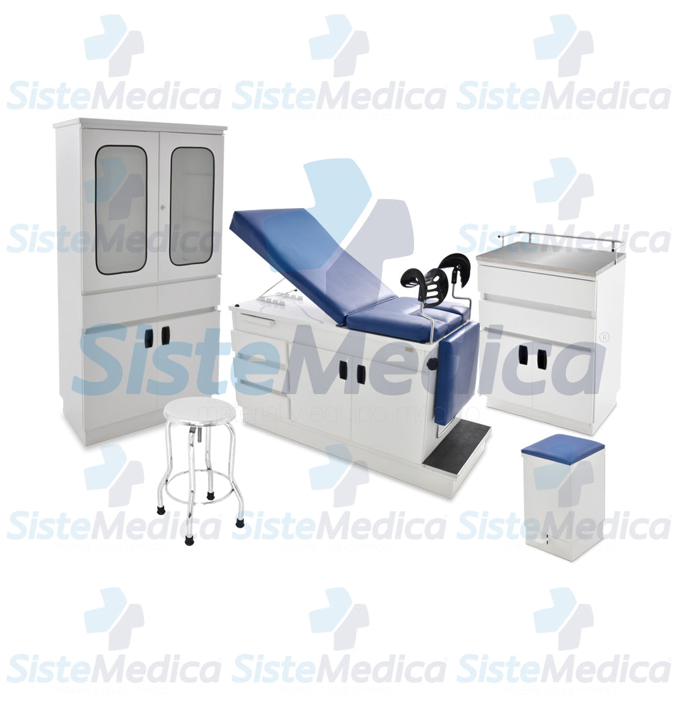 • Consta de 5 piezas (Mesa exploración, Vitrina sencilla, Gabinete, Banco giratorio sin ruedas, Bote de basura).